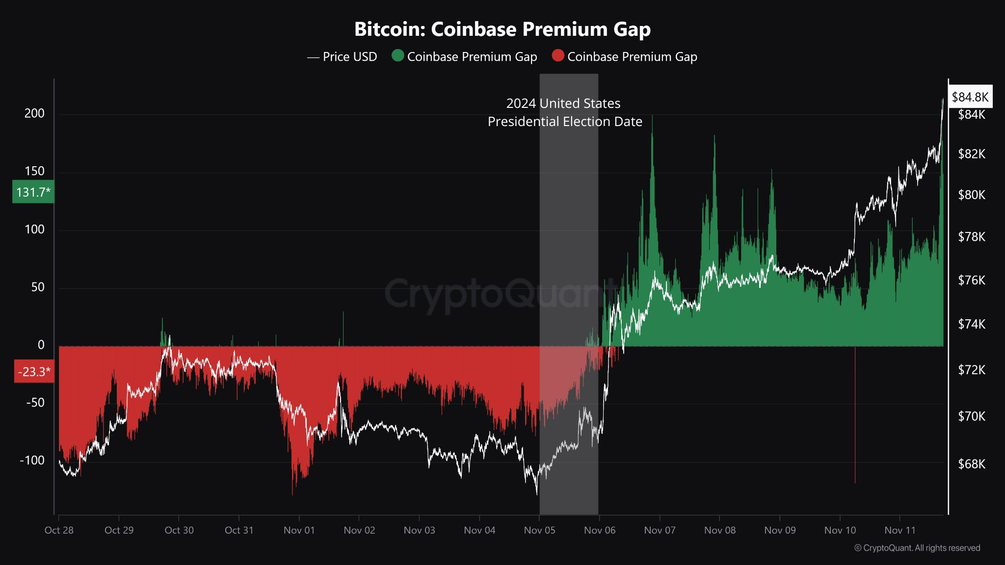 A higher premium suggests stronger buying interest from US investors as Coinbase is one of the primary, regulated, exchanges used by US institutions.
