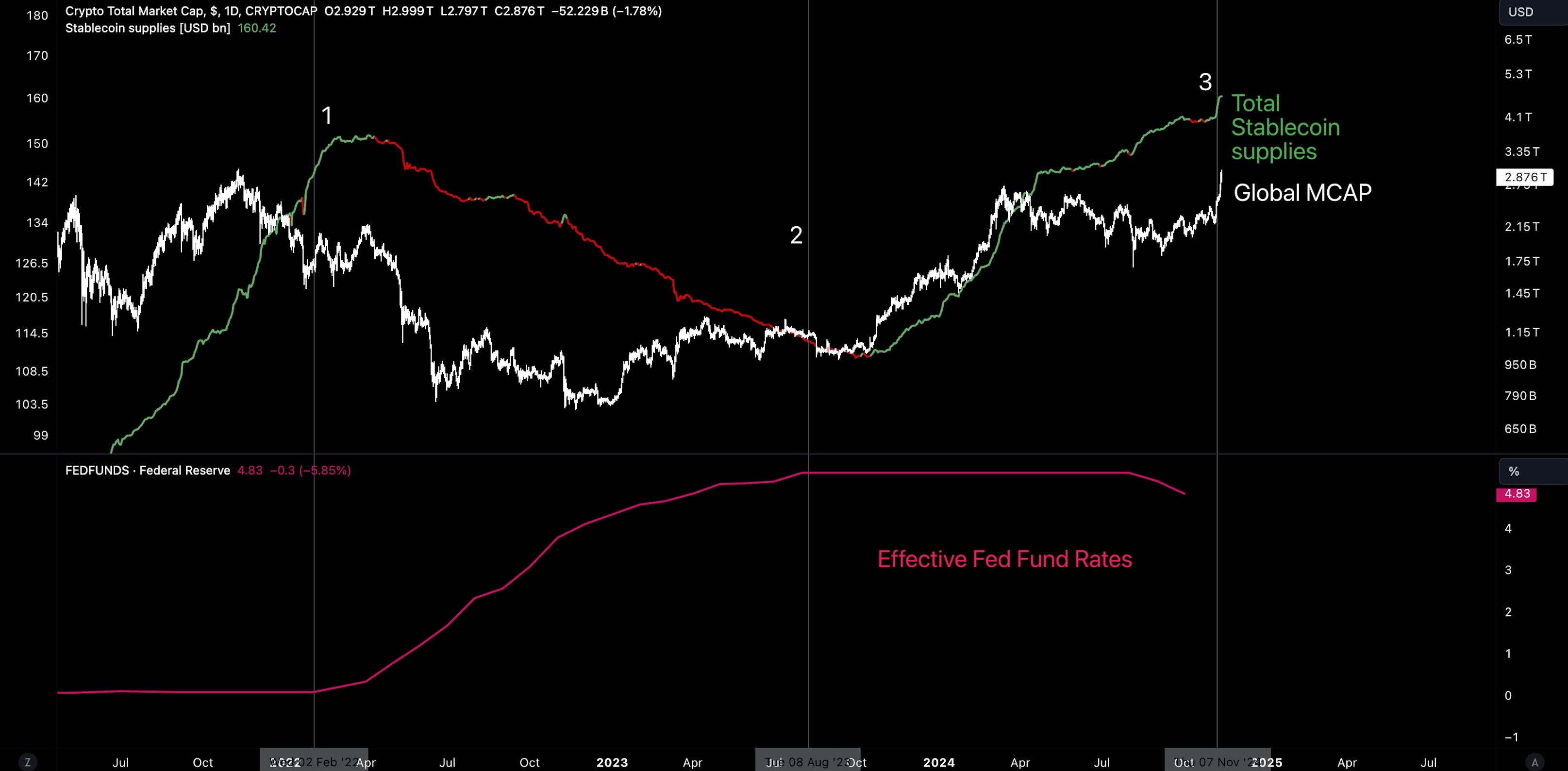 Increased stable supplies signal increased capital flows into the crypto market as we can see from the correlation between stable supplies and global market cap.