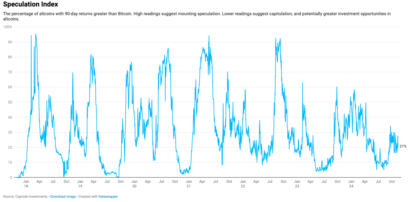 At the same time, indices measuring the magnitude of altcoin speculation are near cyclical lows, not highs showcasing the potential room left for alts to run this cycle.