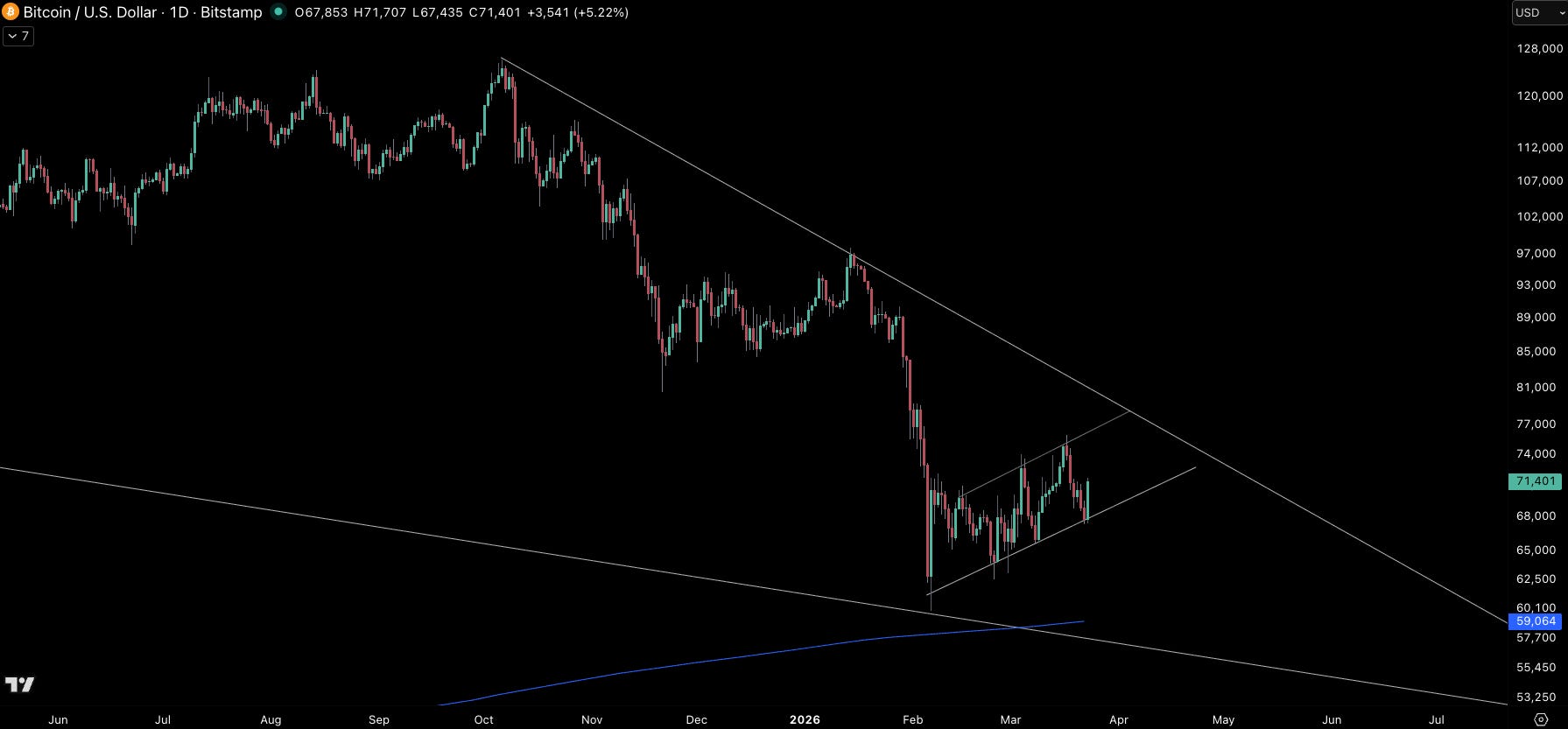 BTC has re-bounded strongly off its channel lows to >$71k. A clearer momentum break is now likely to no longer be $74k per se but a break out of its larger wedge pattern to the upside.