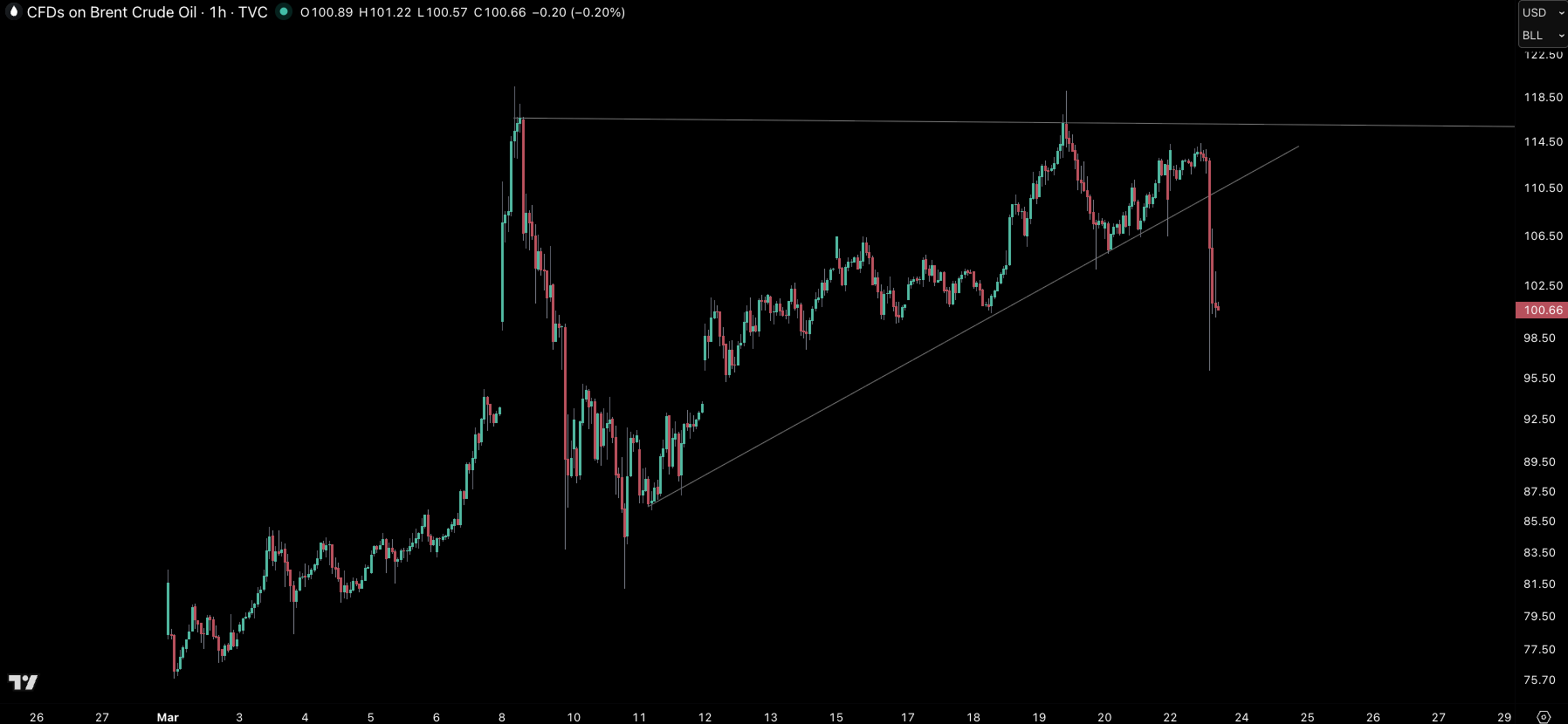 Brent oil has now broken below its March trend after being unable to get above $120.