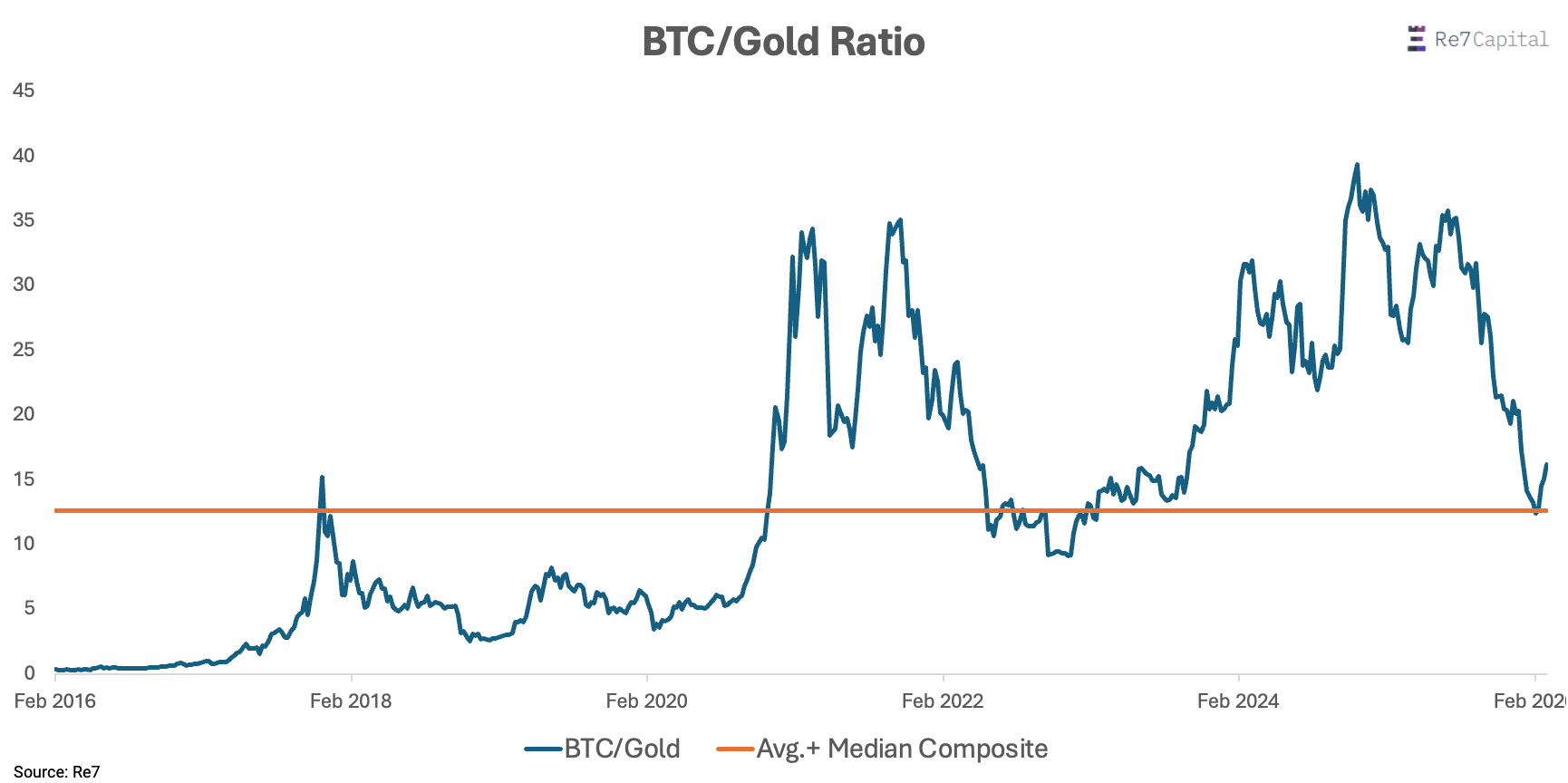 One interesting observation is the BTC/Gold ratio recently bounced off its 10y average/median composite (~12.3).