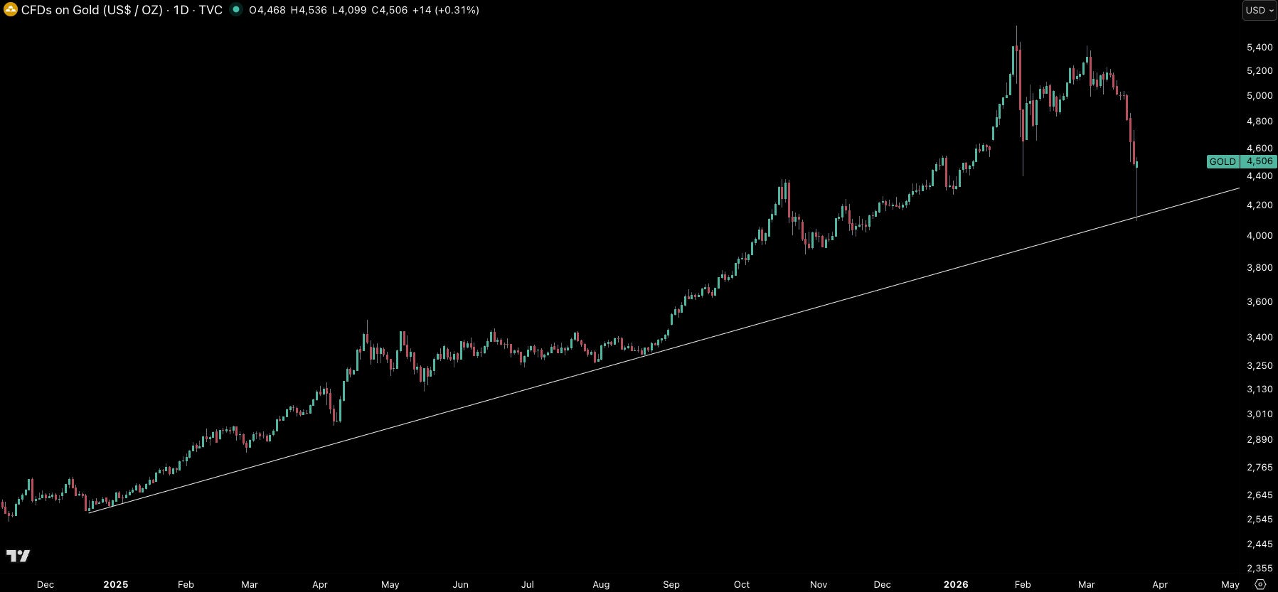 Gold’s sharp retreat on Monday (-9%) came mainly coming from stronger dollar and higher treasury yields off the back of renewed inflation fears from energy disruptions. Gold has since re-bounded (+11%).