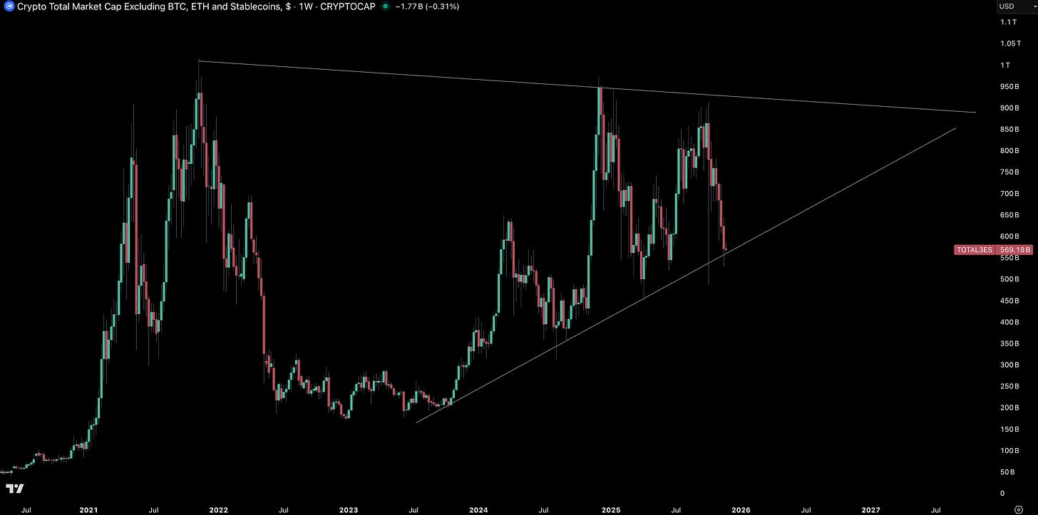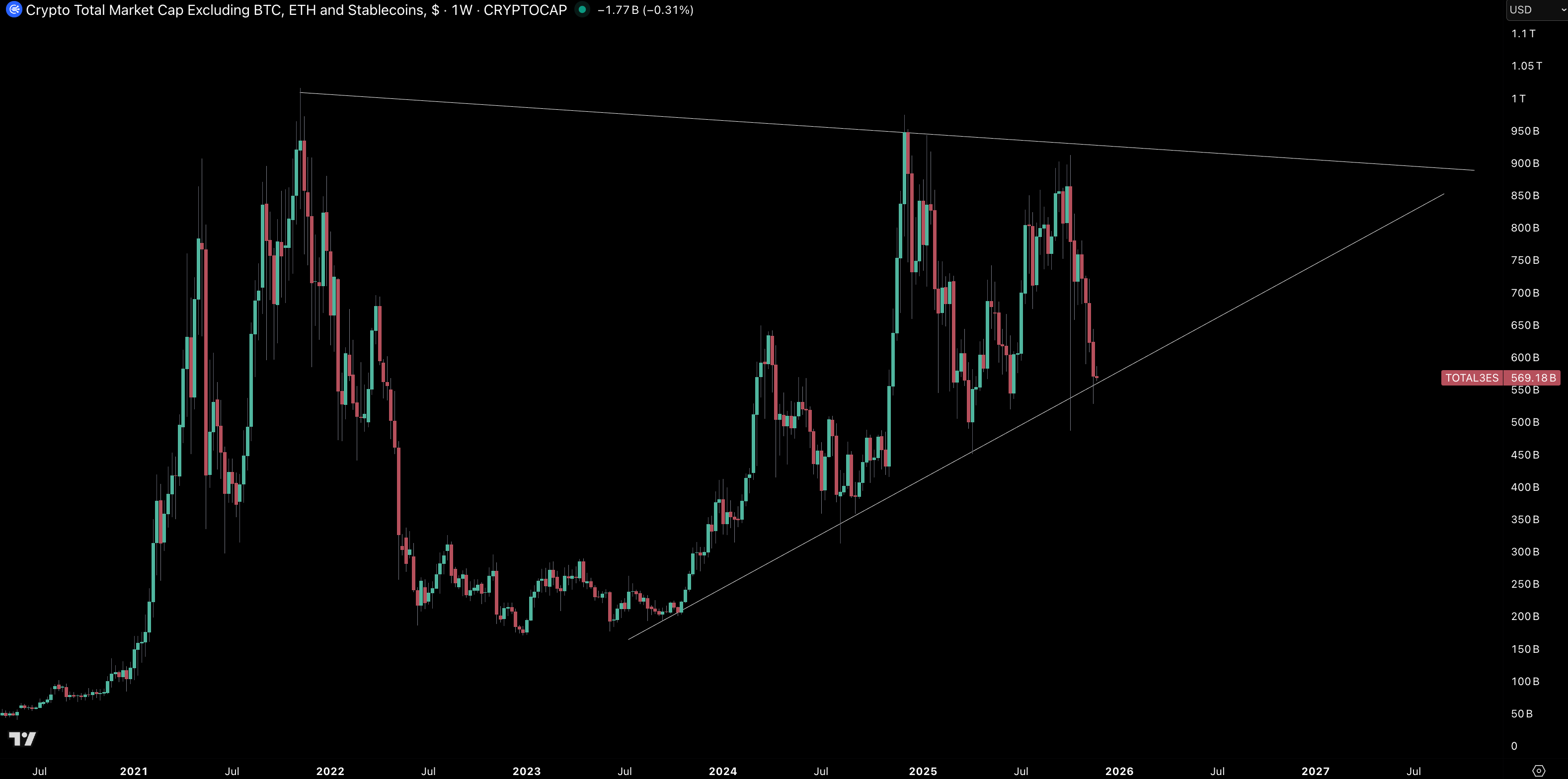 We see this with alt indices too. The market capitalization excluding BTC and stablecoins is being tested at support, yet not invalidated when it comes to its broader structure.