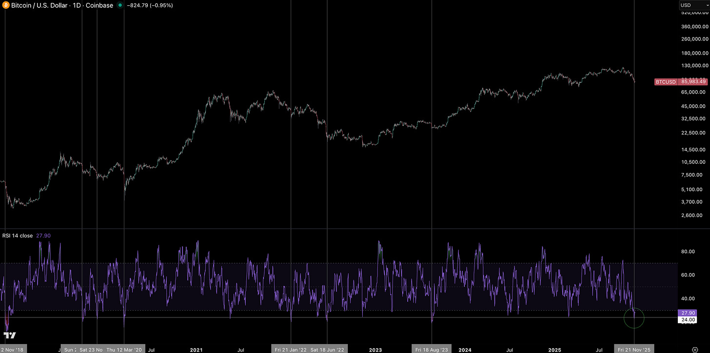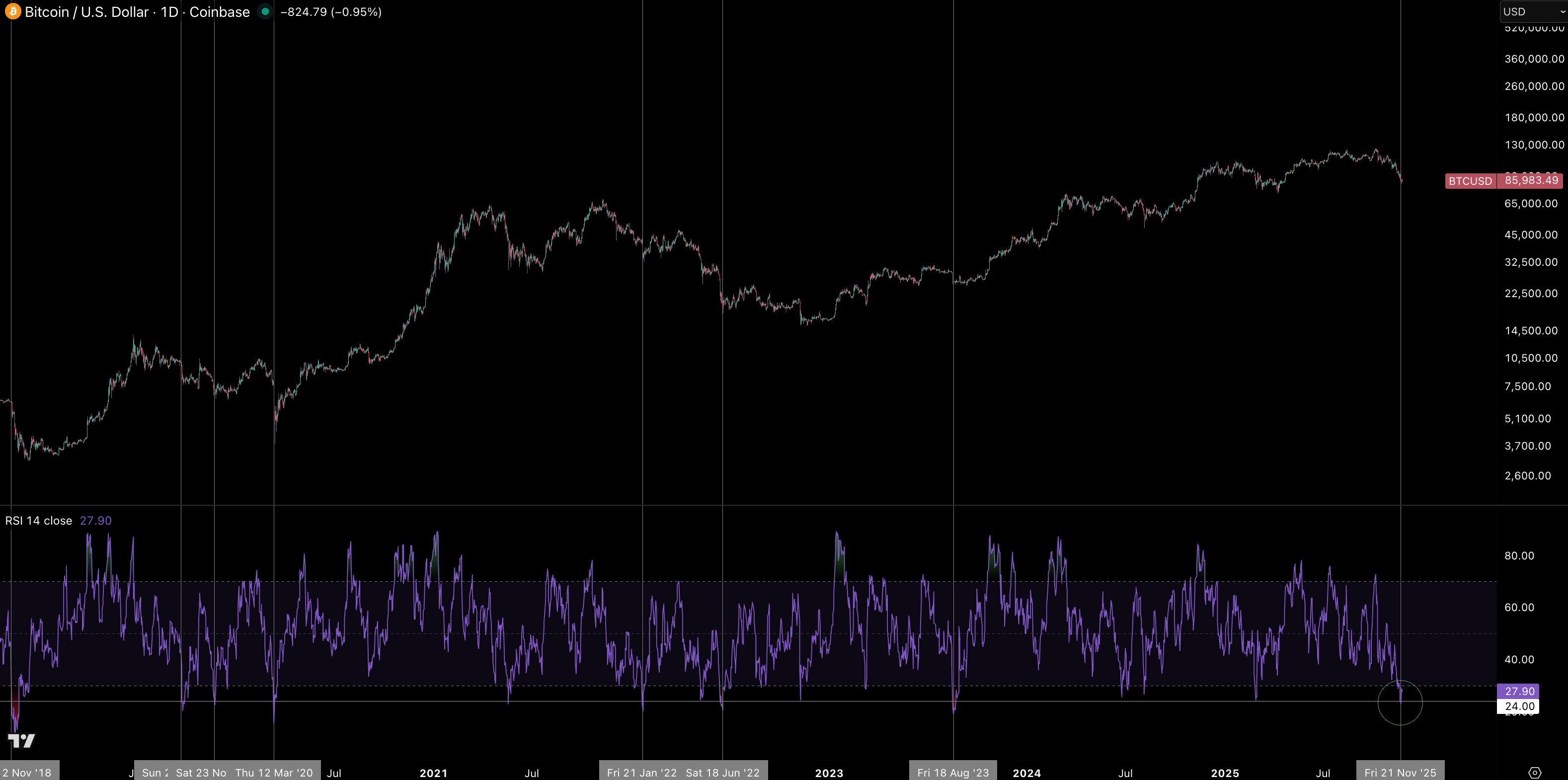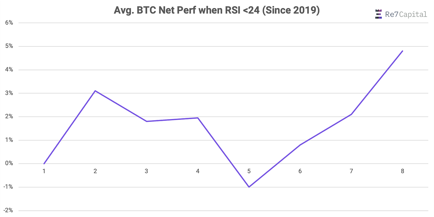 Since 2019, when daily RSI falls below 24, BTC chops for a few sessions before a relief rally ensues regardless of it being in a bear or bull market.