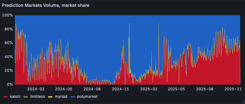 For volume, Kalshi has overtaken Polymarket (now 60/40 split) where its distribution through the Robinhood exchange has given it an edge for accessibility.