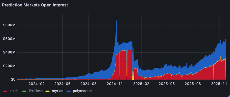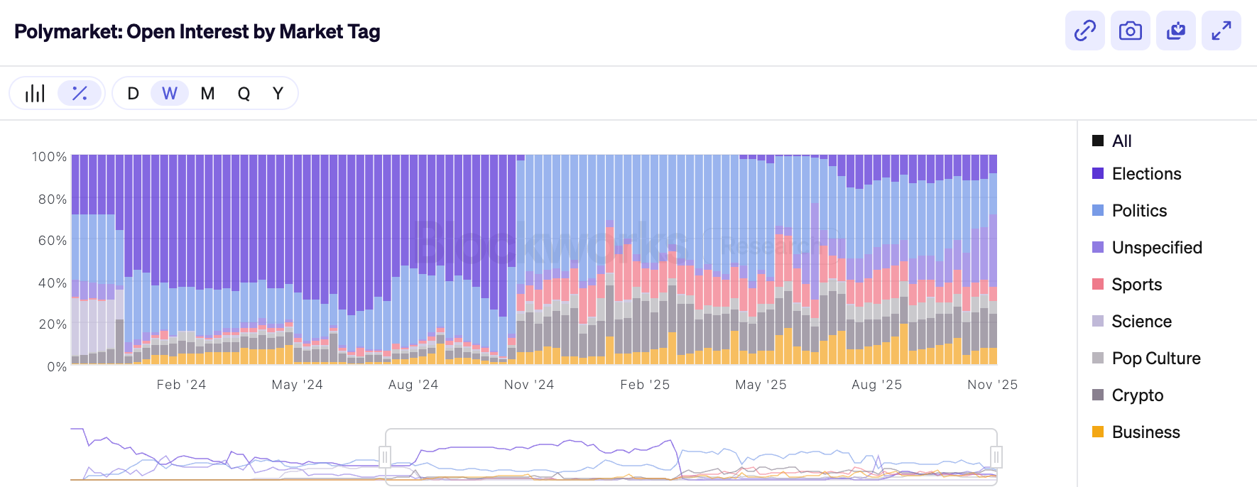 After the election resolution, users explored other ways to express bets, leading to increased OI shares in sports and pop culture.